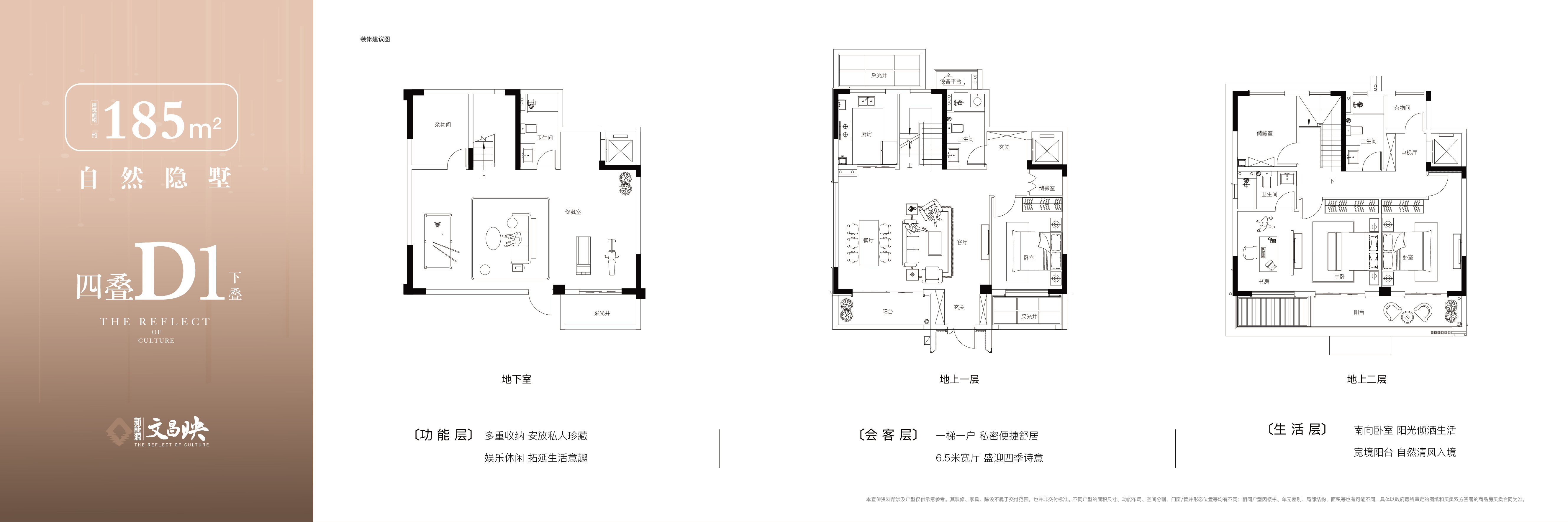 产品类型主要有联排别墅(建面约198-251㎡)、4叠&6叠别墅(建面约185-201㎡)和2栋洋房(建面约102-124㎡),低层业态配有私家庭院,公共空间布置活力组团花园。