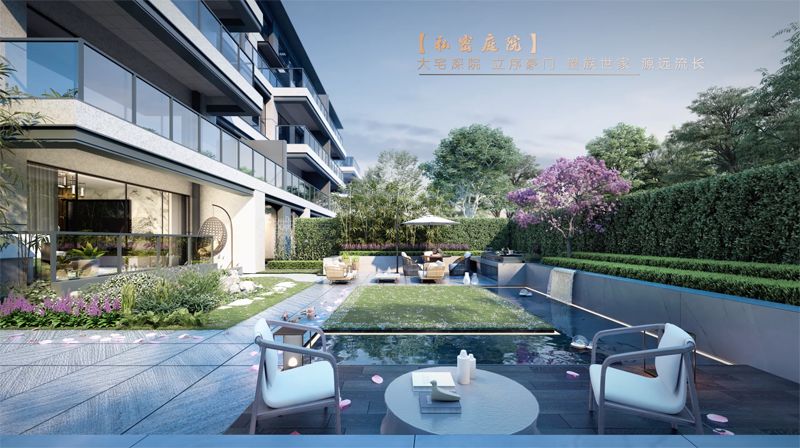 入口处隐约可见的水幕溪流景观演绎家族的门风礼赞;龙曲水景倒影绿林,光影纵横泼墨如画,营造从大门到宅邸的递进式体验。