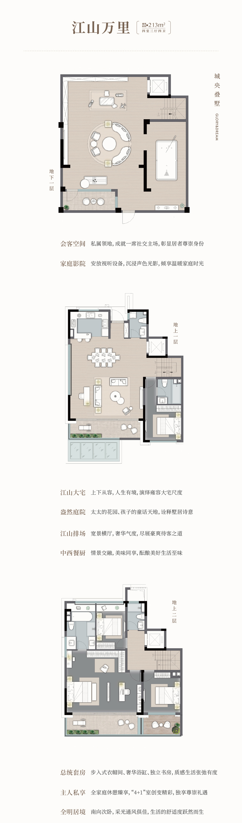 项目以「1.5低容积率」低密大境,规划洋房(建面约109-216㎡)、叠加别墅(建面约213-233㎡)两类产品,墅造全新居住境界,低层业态配有私家庭院,公共空间以江山画境为魂,打造沉稳浑厚、磅礴大气的儒门礼序,构建人景融合、居游一体的 “江山十境”规制,创造一个诗意居住、人文共荣、生活机能与精神栖居完美相融的东方意境。