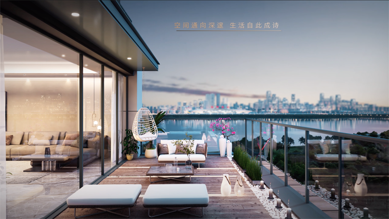 窗墙比越高,室内越通透明亮,当前住宅窗墙比一般为0.25-0.35,而江山映做到了0.51,窗线比更是做到1:0.62的黄金比例,清透的巨幕玻璃以及柔边铝翼等设计,建筑灵动、通透,当蔚蓝的天空倒影其上,宛若立体海洋,又与天空融为一体。
