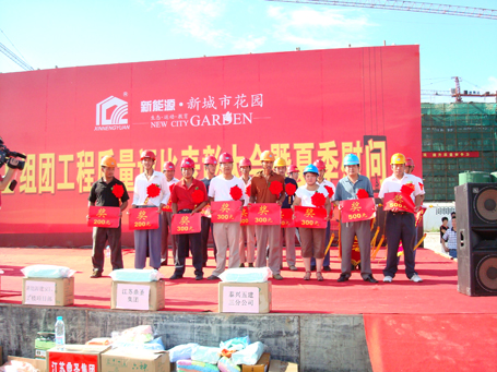 表彰大会现场为新城市花园1组团工程质量评比大赛中胜出的施工单位、先进班组及先进个人举行了颁奖典礼,新能源置业集团有限公司领导为获奖者们颁发了锦旗和奖金,并给一线工人发放了毛巾、矿泉水、香皂、人丹、清凉油等慰问品。