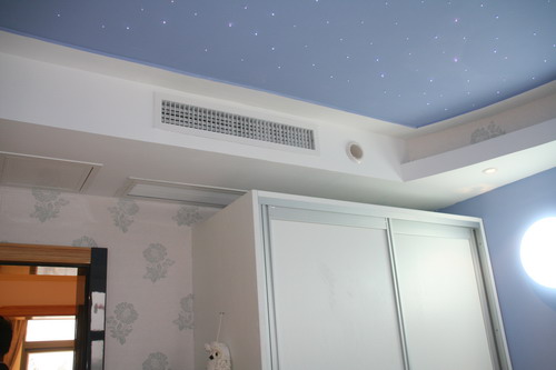 在阳光美第的样板房内,我们在各个房间来回走动,感受到温度非常平衡,人也感到非常舒适。室温稳定在18-20℃,据工作人员介绍,这样的温度一方面可以节约能源,减少电力损耗,一方面可以降低室内外温差,在保证舒适度的前提下尽可能避免由于内外温差过大可能给人体带来的不良影响。在每套住宅的各个房间内都有出风口、回风口,相当于各个房间都安装了独立空调,温度可以根据自己需要自行调节,不使用时也可以关闭,非常方便。出风口、回风口隐藏在天花板上,不占空间、不碍视线,如果不出门,浑然不知窗外已是白雪纷飞的冬日。真有桃花源中不知有汉、无论魏晋;的意趣呢!