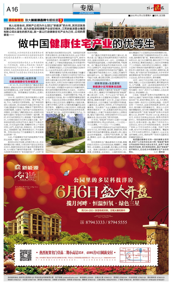 9年前,新能源;在泰兴开始规模开发,到目前为止建成了新城市花园、华清园、新能源美食休闲广场、新城市豪庭、阳光一品、水木清华、铂金公馆等一批住宅小区和商业楼盘。这些项目有一个共同点,全部采用新能源、新材料、新技术,是货真价实的健康住宅。再加上小区环境的精雕细刻,成为泰兴最靓丽的风景。目前在建的新世界广场是新能源;在泰兴开发的最大小区,新世界广场占地1100亩,拥有生态住宅、科技住宅和商业综合体,是泰兴的城市新中心。特别是拥有地源热泵和新风系统的科技住宅,在泰兴首屈一指,填补了该市住宅小区的空白,成为众多市民的购房首选。新世界广场有10万平方米的中心河道,构成了天然水景,成为不可多得的生态走廊景观。覆盖有15万平方米的名贵花木,五重设计,让业主生活环境锦上添花,使新世界广场成为名副其实的健康花园社区。