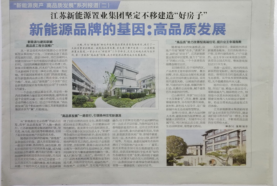 从一家县级机构农村能源办公室创新转型从事房地产开发,一开始就品尝了高品质发展的甘甜。那是1994年,邗江县被列入创建全国100个农村能源综合建设先进县的行列,当时的两幢新能源住宅示范楼工程,就集太阳能热水器、污水沼气净化池和节电节水新材料于住宅一体化示范,结果一炮打响,并引起国家和省有关部门的高度重视,作为新能源高品质示范工程在全国、全省大力推广,至此,冠以“新能源”三个字的“邗江县新能源房屋开发有限责任公司”于1996年5月诞生。