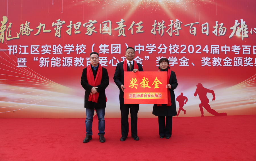 ‘新能源’在发展的同时,一直将支持教育、参与社会公益作为企业文化的重要组成部分,做到取之于社会,回馈于社会。今天的奖学金、奖教金共96000元,凝聚着‘新能源’全体员工的一片爱心,将激励同学们努力拼搏,奋发向上,拿出愚公移山的志气和滴水穿石的毅力,脚踏实地、埋头苦干,在这次中考中取得佳绩。”