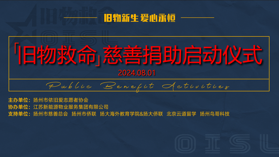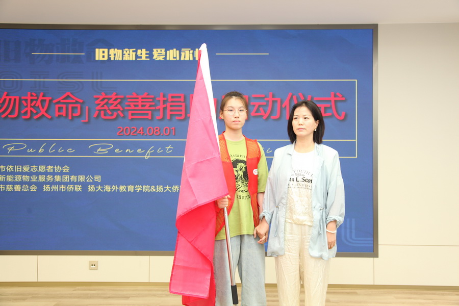 8月1日,“旧物救命”慈善捐助启动仪式在新能源数智大厦举行。此次活动由扬州市依旧爱志愿者协会主办,江苏新能源物业服务集团有限公司协办,扬州市慈善总会、扬州市侨联、扬州大学海外教育学院、北京云道留学咨询有限公司、扬州鸟哥科技有限公司等为支持单位。